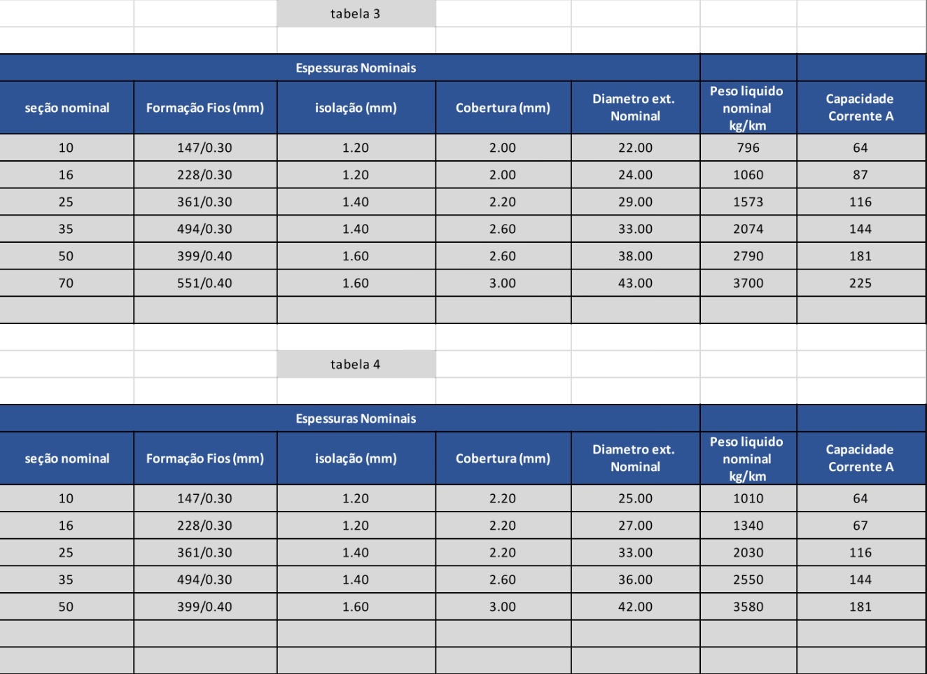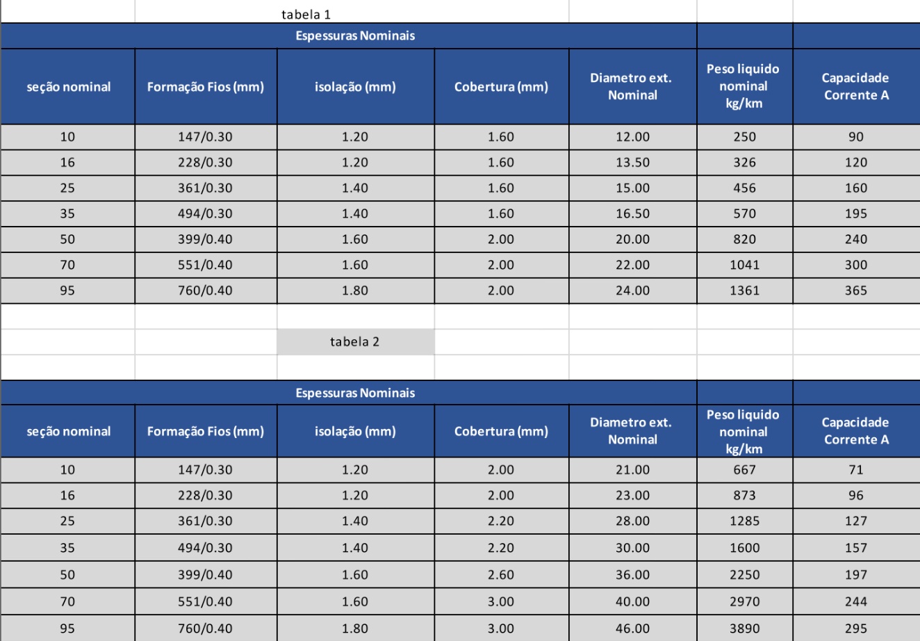 – São fornecidos os dados construtivos dos cabo ”W – M” de nossa linha normal de fabricação. Cabos de construção, seção, números de condutores e formação diferentes dos constantes das tabelas, podem ser fabricados mediante consulta.